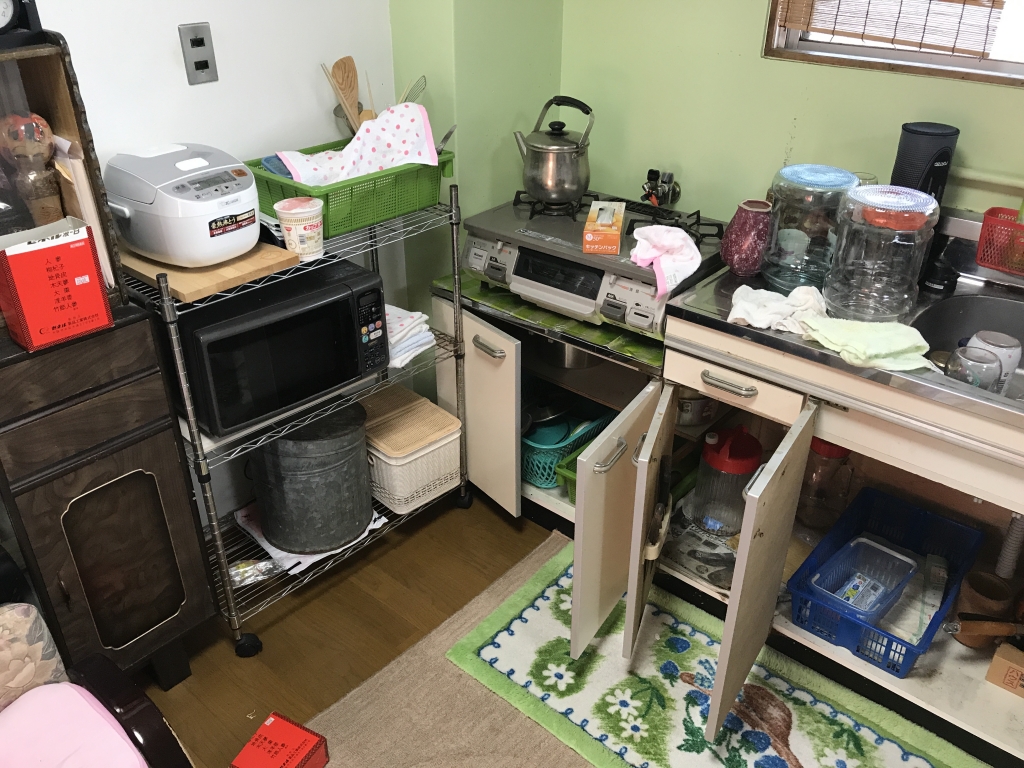 冷蔵庫、洗濯機、瓶類、食器、こたつ、キッチン用品、食器棚、電子レンジ、トースター、鍋、カラオケマシーン、扇風機、布団、ツボ、植木鉢、書類、本類、仏壇、花瓶、日本人形、プラスティック雑貨、着物類、衣類、ハンガーラック、物干竿、鏡台、クローゼット、箪笥、洗面道具、ブロック類