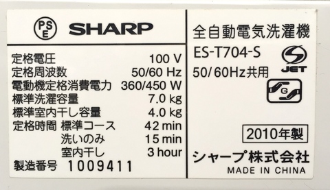 HOME> 全ての買取実績 > 家電・電化製品類 > 家電の買取実績 (SHARP/シャープ 7kg 全自動洗濯機 ES-T704 2010年製)