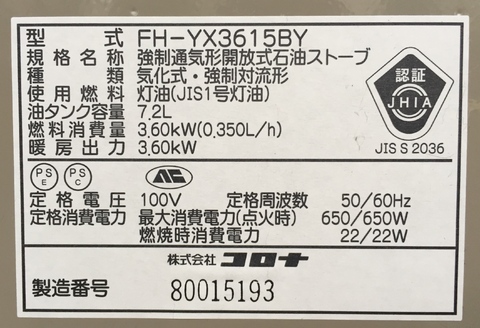 家電の買取実績 (CORONA コロナ 石油ファンヒーター FH-YX3615BY-N 2015年製)の買取り実績
