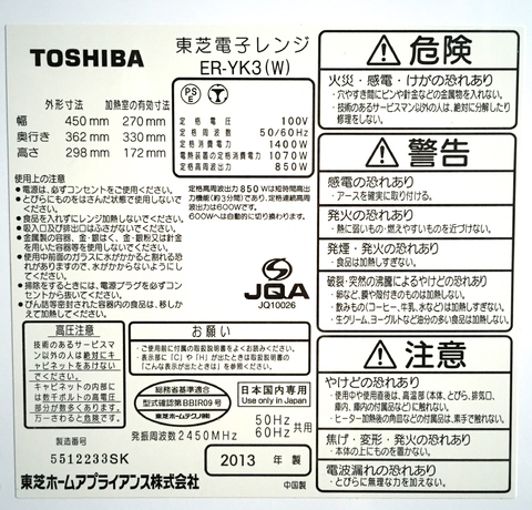 家電の買取実績 (東芝/TOSHIBA 石窯ドーム オーブンレンジ ER-YK3)の買取り実績