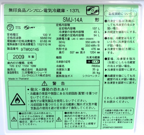HOME> 全ての買取実績 > 家電・電化製品類 > 家電の買取実績 (無印良品 2ドア冷凍冷蔵庫 SMJ-14B 137L 2009年製)