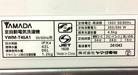 家電の買取実績 (YAMADA 山田電気 オリジナル 全自動洗濯機 YWM-T45A1 4.5kg 2014年製)の買取り実績