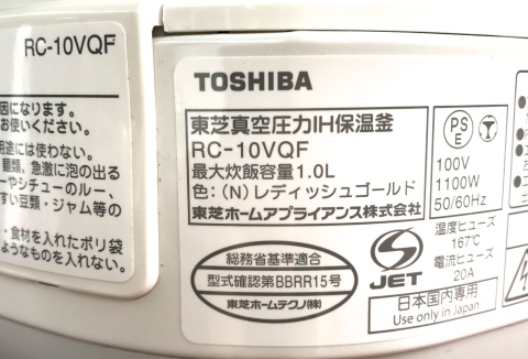 家電の買取実績 (TOSHIBA 東芝 真空圧力IH保温釜 炊飯器 RC-10VQF 2013年製)の買取り実績