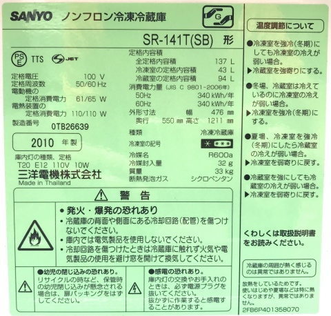 HOME> 全ての買取実績 > 家電・電化製品類 > SANYO 三洋 サンヨー 2ドア冷凍冷蔵庫 SR-141T 2010年 137L