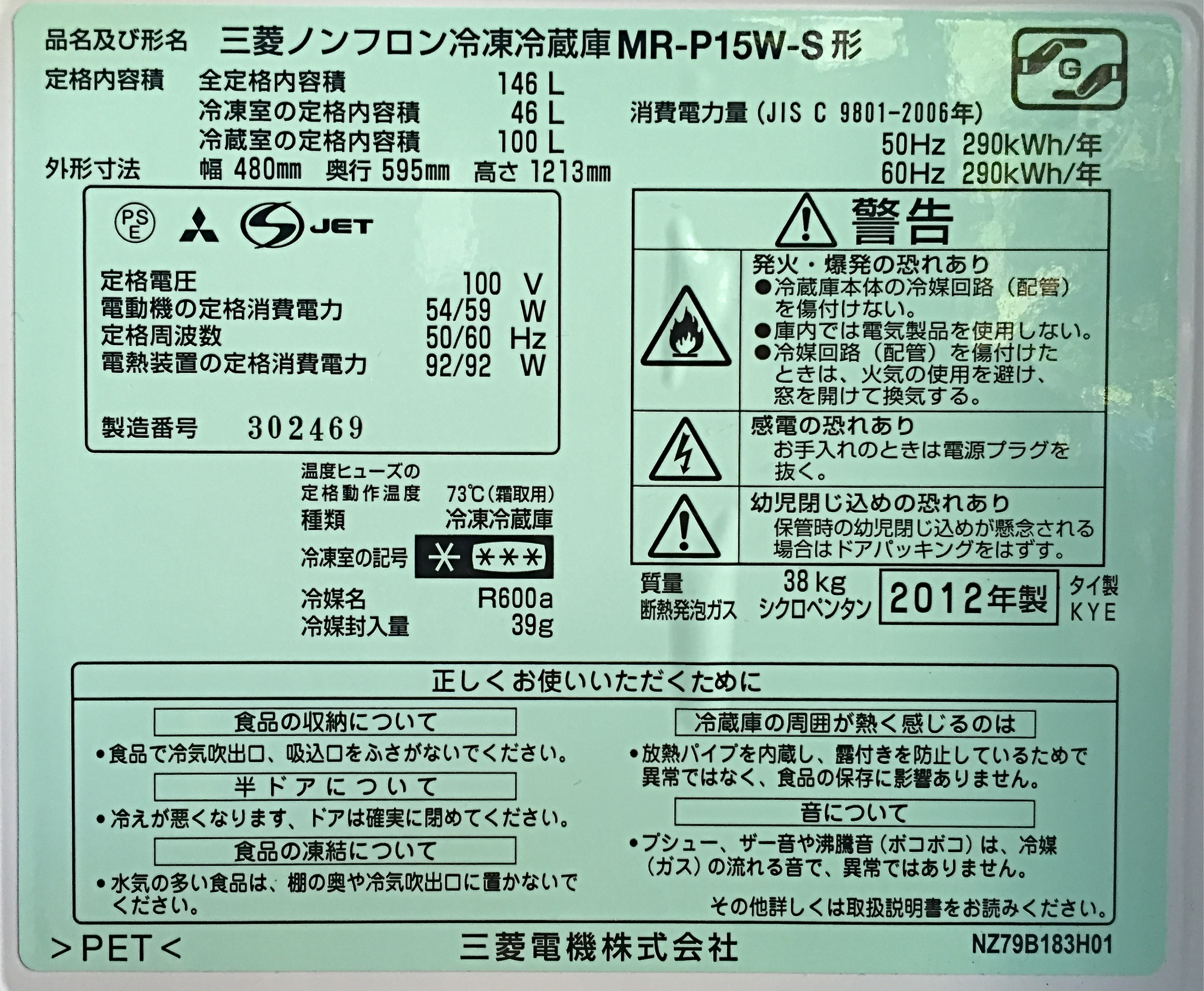 HOME> 全ての買取実績 > 家電・電化製品類 > 冷凍冷蔵庫の買取実績(MITSUBISHI/三菱 ノンフロン冷凍冷蔵庫 MR-P15W-S 146L 2012年製)