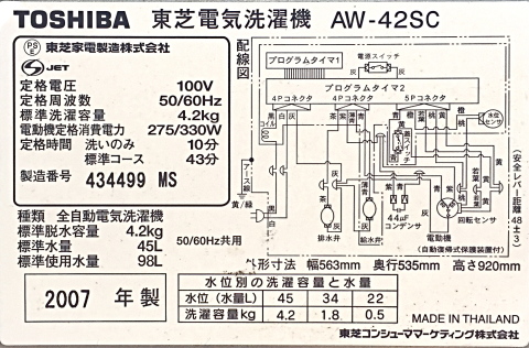 洗濯機の買取実績(TOSHIBA/東芝 電気洗濯機 AW-42SC 2007年製)の買取り実績